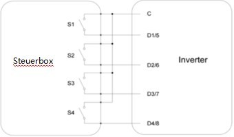 S1 | S2 | S3 | S4 | Steuerbox | Ausgangsleistung (in % der Nenn-Wechselstromleistung) |