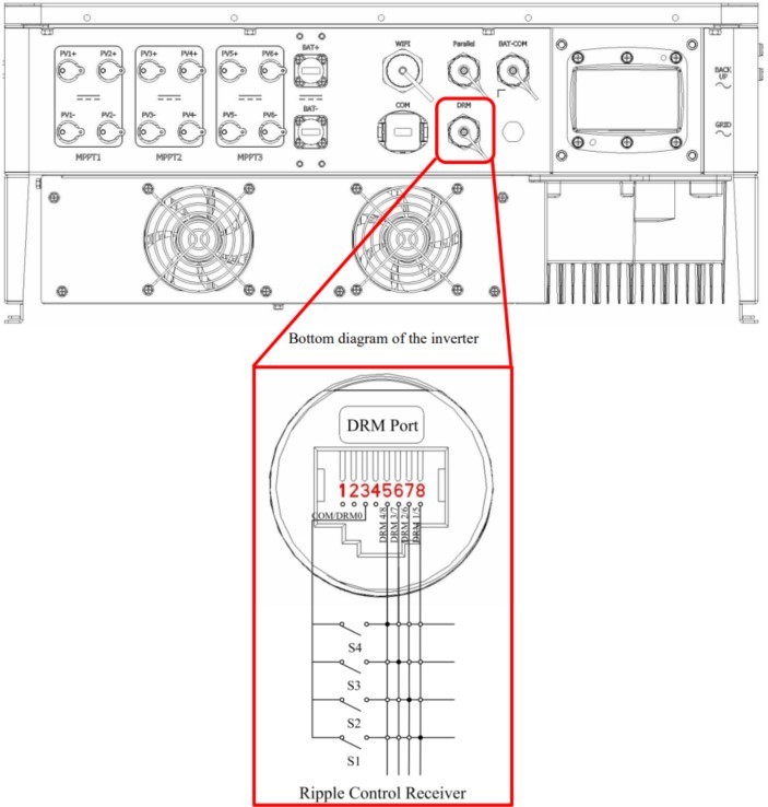 Die dreiphasigen Hybridwechselrichter (HV) SiH-5–10kW-TH sowie SiH-10PRO–50kW-TH verfügen über dieselbe DRM-Pinbelegung.